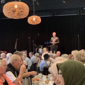 Efter vores sejltur kørte bussen tilbage til Medborgerhuset hvor der blev serveret smørrebrød øl vin vand, snaps og Borgmester tale igen og sluttede af med kaffe, lagkage og sanger og entertainer Michael Carøe.